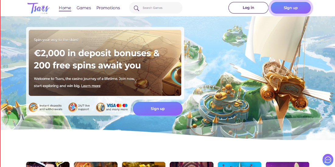 Tsars Kazino oyunçuları cəsarətli, hekayəyə əsaslanan mövzu ilə ovsunlayır, o, vintage yelkənli təsvirləri futuristik hava gəmiləri ilə birləşdirib - kral macərasının və yüksək uçuş əyləncəsinin unikal dünyasını yaradır. Əsas vizual palitrası sakitləşdirici ağları və canlı bənövşəyi rəngləri qarışdıraraq, təmiz və cəlbedici interfeys təklif edir... Tsar Kazinosu cəlbedici dizaynı ilə seçilir. Naviqasiya intuitivdir: oyunlar növə və ya provayderə görə qruplaşdırılır və axtarış və filtr alətləri slotları, canlı masaları, Megaways və cekpot oyunlarını kəşf etməyi asanlaşdırır..
