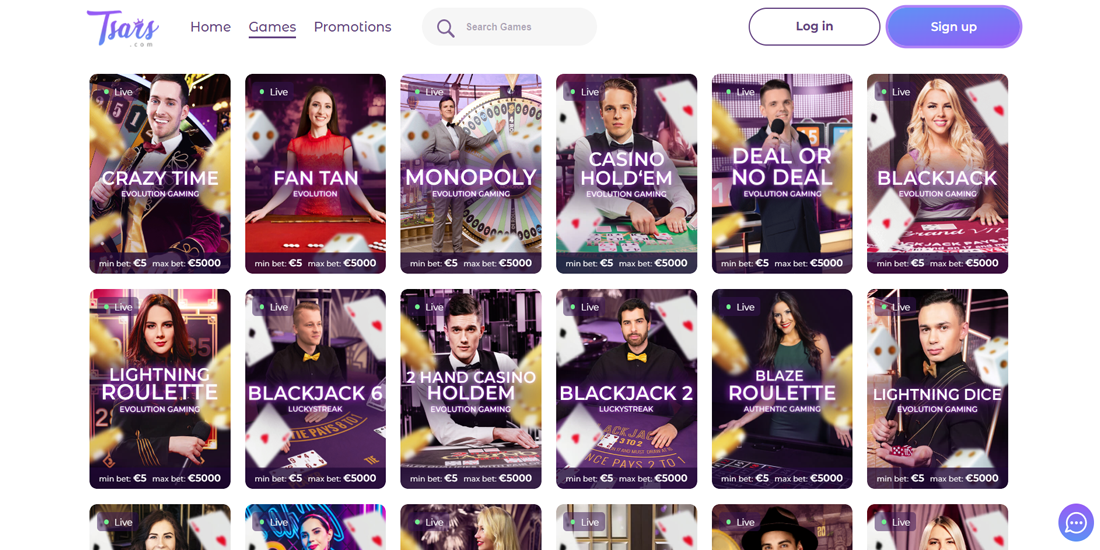Sizə deyəcəyimiz növbəti şey Tsars-da canlı kazinodur və biz buna çox sevinirik! Tsars Kazino sizə nəinki çox sayda slot, stolüstü oyunlar və kart oyunları təklif edir, həm də sizi asanlıqla əyləndirəcək canlı oyunların təsirli seçiminə malikdir. Bundan əlavə, siz blackjack, rulet, poker, bakkara və bəzi canlı diler şoularının müxtəlif versiyalarından tam həzz alacaqsınız.